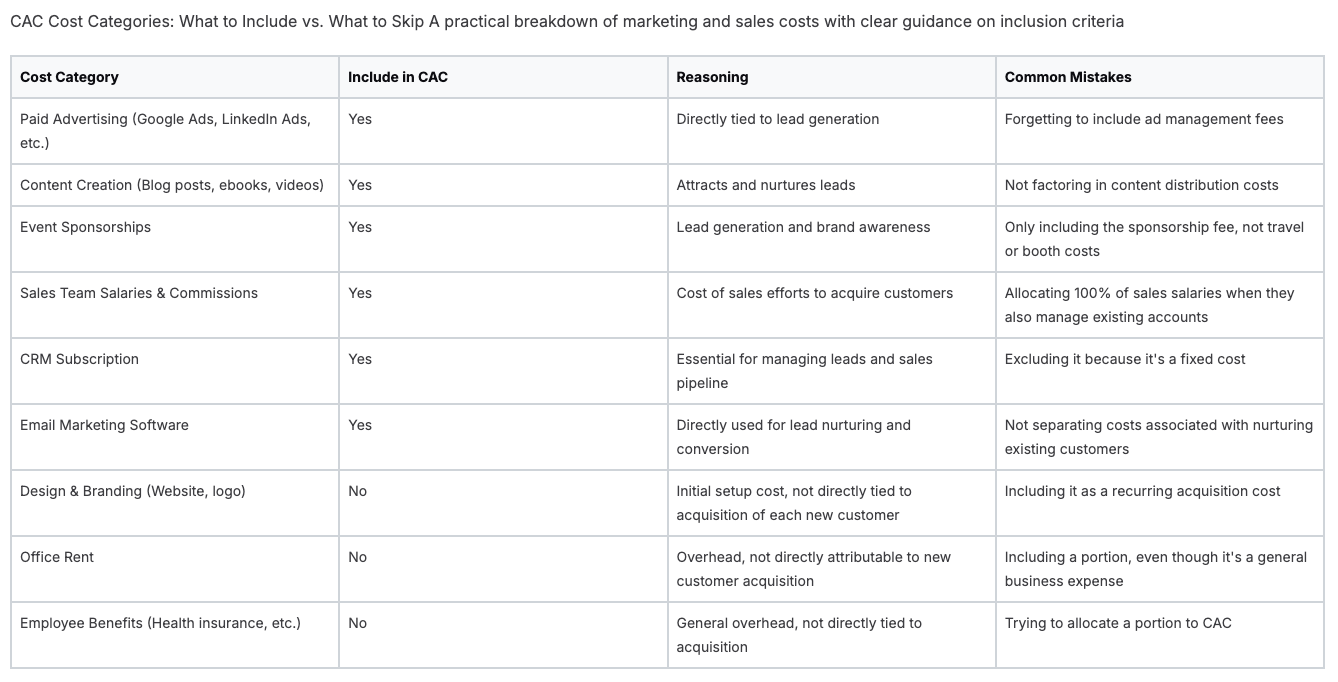 This table clearly outlines what should and shouldn't be factored into your CAC, helping you avoid common pitfalls. Remember, accurately categorizing these costs is the first step towards truly understanding your customer acquisition landscape.